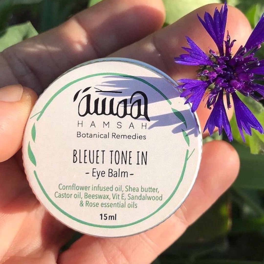 Ingredients: Cornflower/Bleuet infused oil, shea butter, castor oil, beeswax, vit E, sandalwood & rose essential oil.