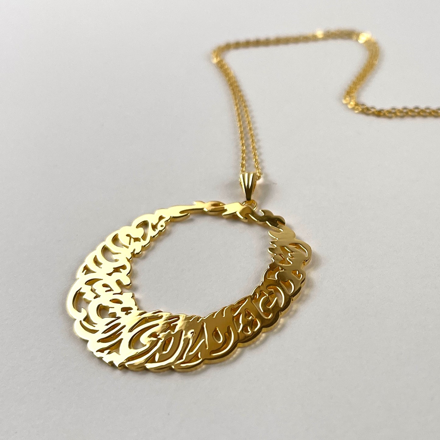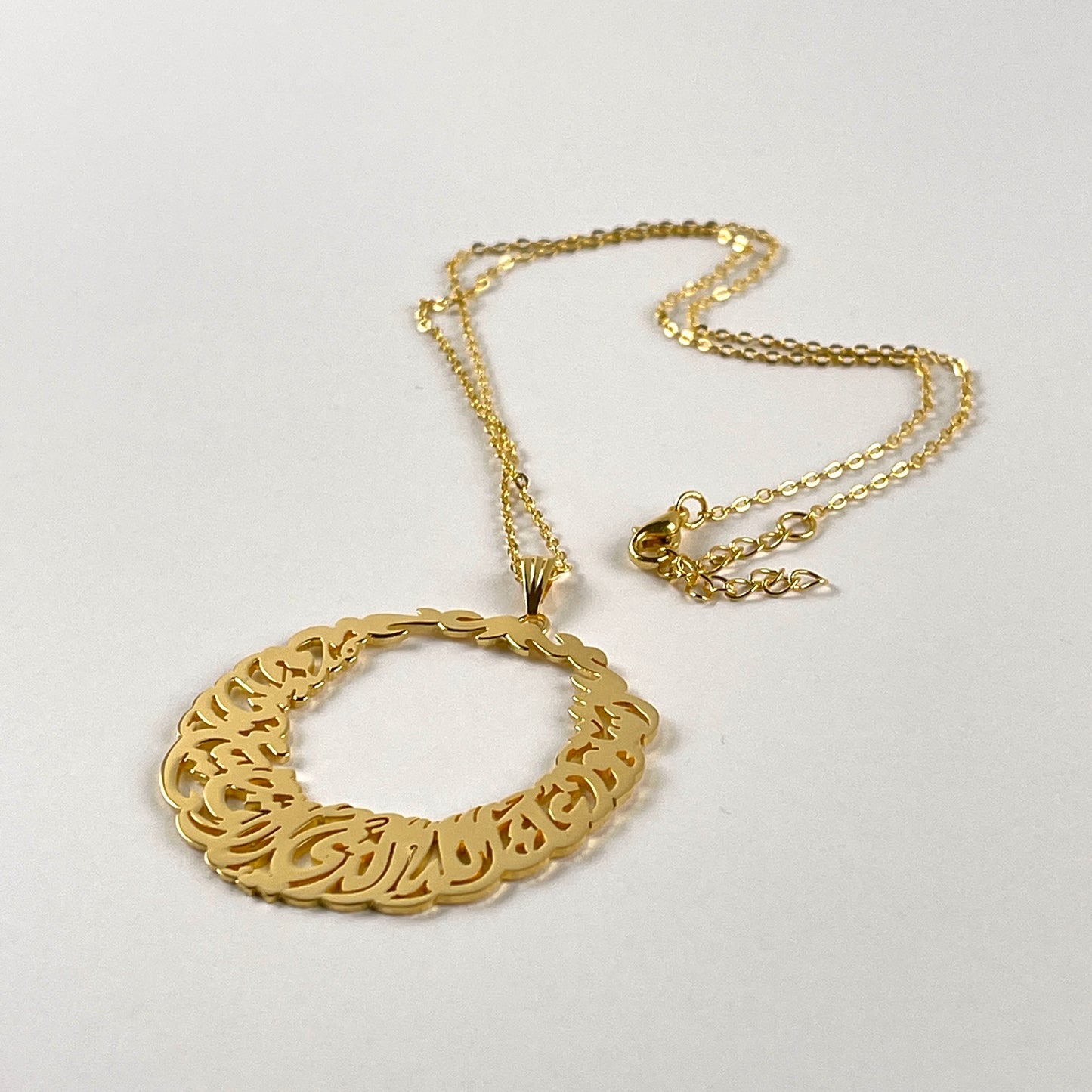 Calligraphy Necklace by Vahan & Ara, made of copper and gold-plated with inscription (أستودعكم الله الذي لا تضيع ودائعه)