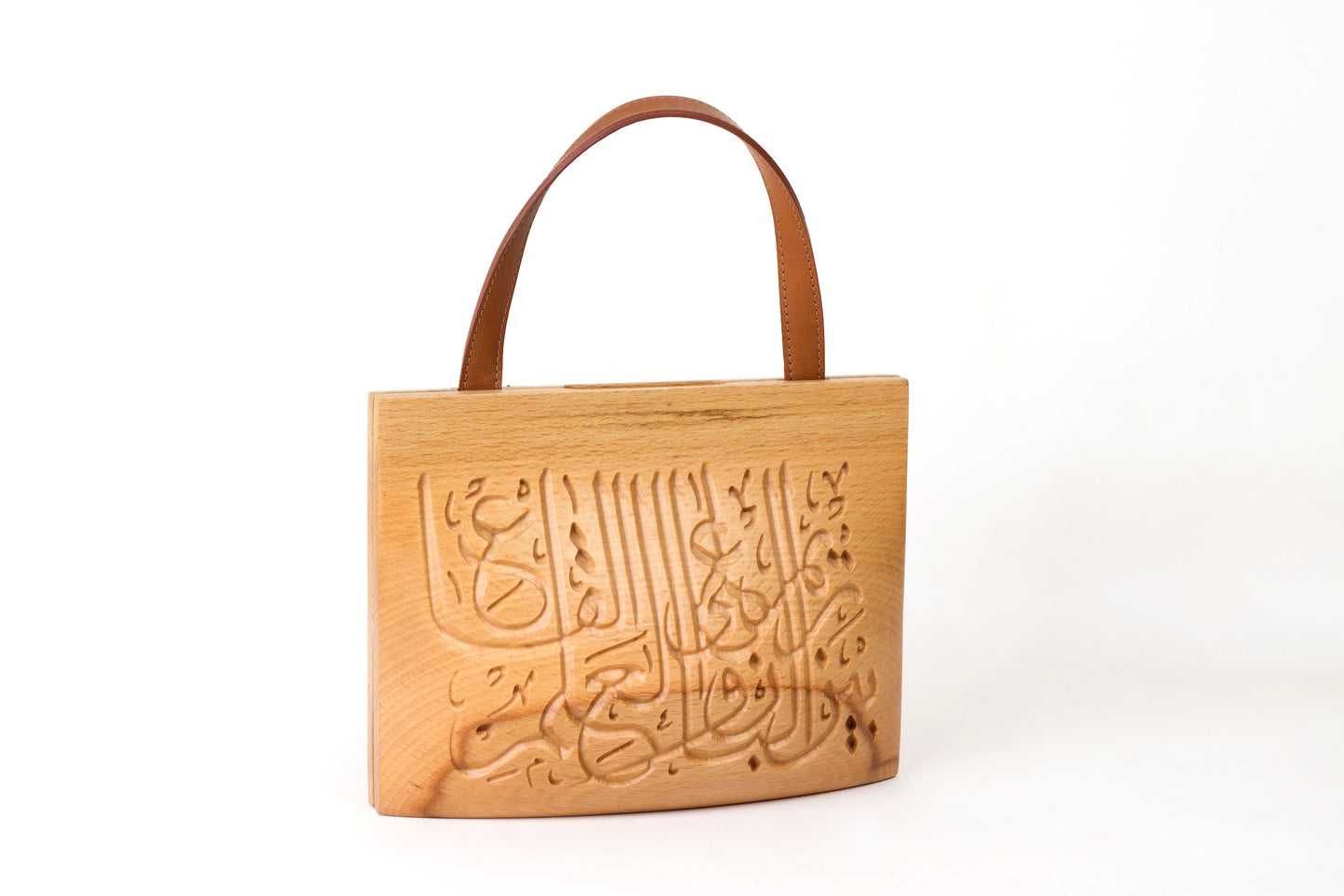 Calligraphy carved, Beech wood clam-shell purse. Inside is hollowed with leather-lining and strap features. Option available for custom order wood type, calligraphy, leather color, and strap length. 19.5 x 9 x 25cm
