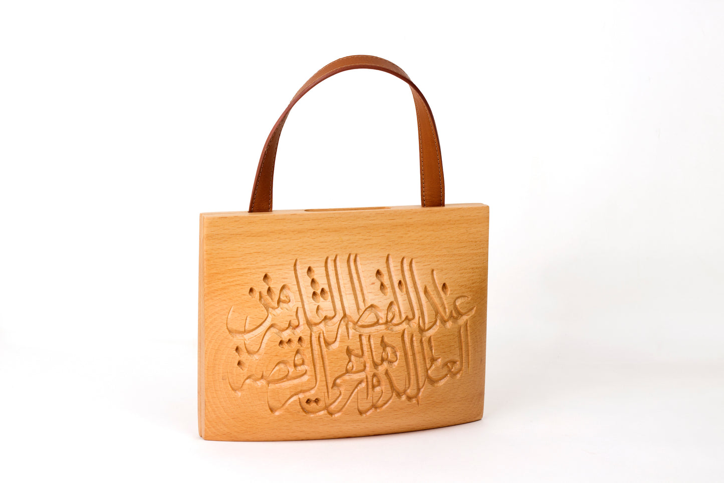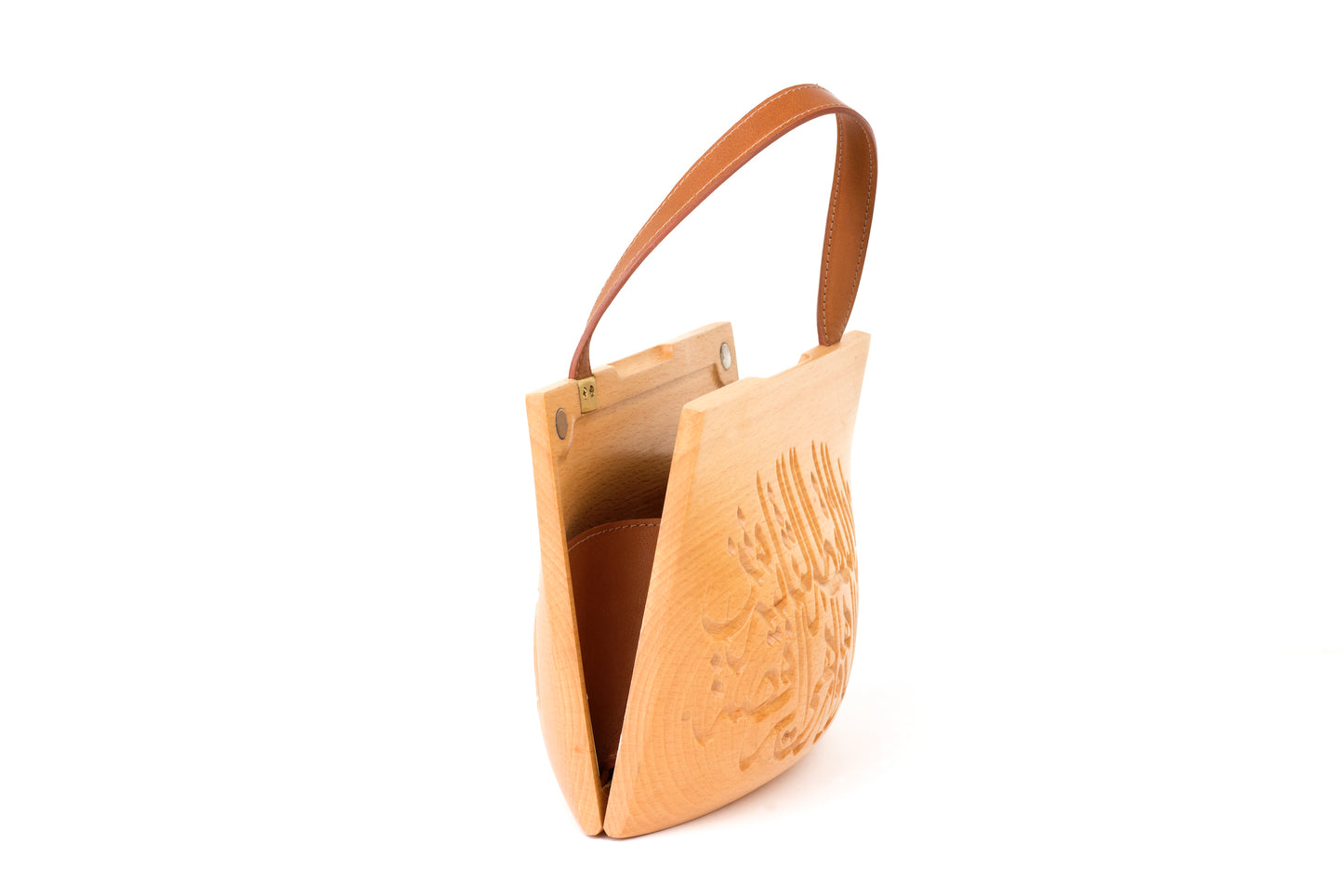 Calligraphy carved, Beech wood clam-shell purse. Inside is hollowed with leather-lining and strap features. Option available for custom order wood type, calligraphy, leather color, and strap length. 19.5 x 9 x 25cm
