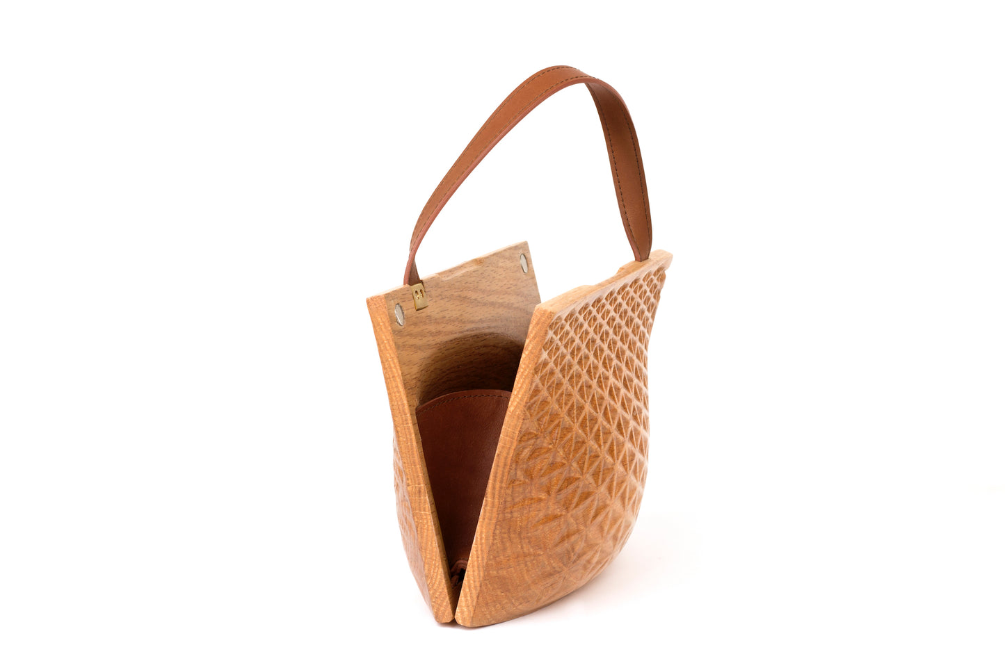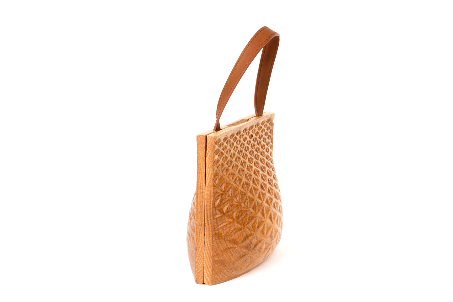 Geometry pattern carved, American Oak wood clam-shell purse. Inside is hollowed with leather-lining and strap features. Option available for custom order wood type, leather color, and strap length.